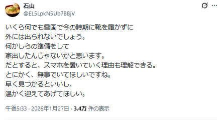 上着や、普段履いていた靴、スマホは家に残されtいたそう。