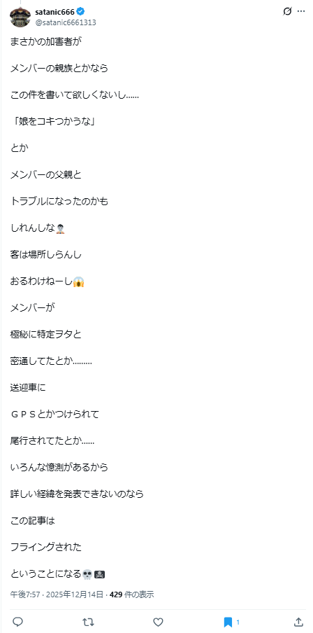 メンバーが 極秘に特定ヲタと 密通してたとか……… 送迎車に GPSとかつけられて 尾行されてたとか……