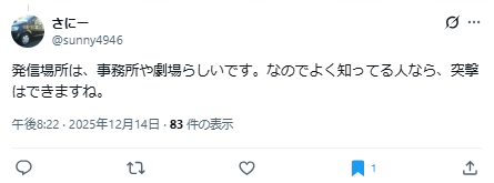 発信場所は、事務所や劇場らしいです。なのでよく知ってる人なら、突撃はできますね