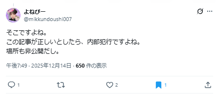 場所が非公開なため内部犯だという人が多いですね。