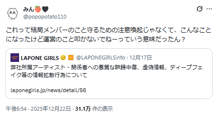 また文春でも、今回脱退が決まった4人は「LAPONEのマネジメントに強い不信感を持っていた」と報じており、世間は事務所の対応に不信感を募らせています。