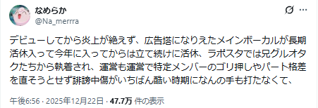 デビューしてから炎上が絶えず、広告塔になりえたメインボーカルが長期活休入って今年に入ってからは立て続けに活休、ラポスタでは兄グルオタクたちから執着され、運営も運営で特定メンバーのゴリ押しやパート格差を直そうとせず誹謗中傷がいちばん酷い時期になんの手も打たなくて、
