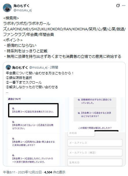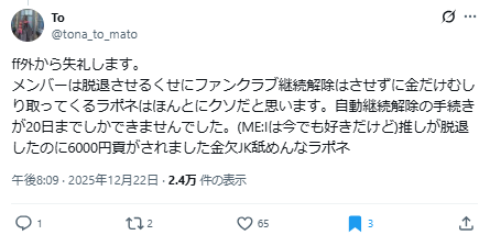 メンバーは脱退させるくせにファンクラブ継続解除はさせずに金だけむしり取ってくるラポネはほんとにクソだと思います。自動継続解除の手続きが20日までしかできませんでした。(ME:Iは今でも好きだけど)推しが脱退したのに6000円貢がされました