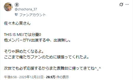 また「THIS IS ME:I」ではソロパートが一切なく、Mステに出演した際にはカメラにすら映らない異常事態に、辞めたくなるのも分かると同情の声が。