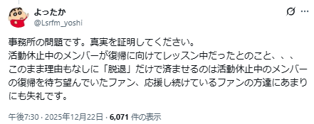 事務所の問題です。真実を証明してください。 活動休止中のメンバーが復帰に向けてレッスン中だったとのこと、、、 このまま理由もなしに「脱退」だけで済ませるのは活動休止中のメンバーの復帰を待ち望んでいたファン、応援し続けているファンの方達にあまりにも失礼です。