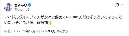 アイドルグループで人が次々と辞めていく中1人だけずっといる子ってだいたいそいつが癌、疫病神