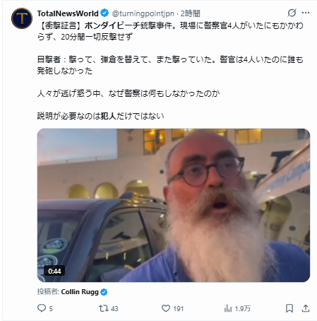 【衝撃証言】ボンダイビーチ銃撃事件。現場に警察官4人がいたにもかかわらず、20分間一切反撃せず 目撃者:撃って、弾倉を替えて、また撃っていた。警官は4人いたのに誰も発砲しなかった 人々が逃げ惑う中、なぜ警察は何もしなかったのか 説明が必要なのは犯人だけではない